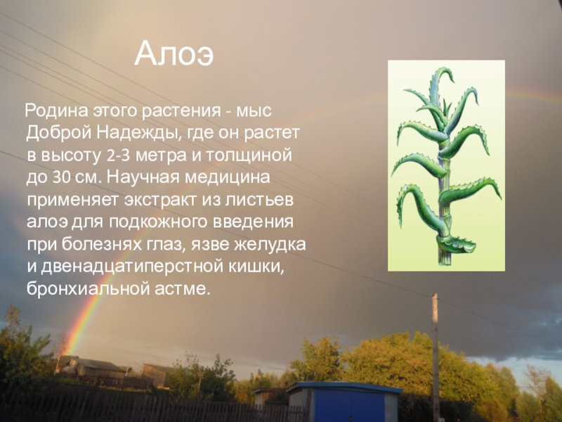 растет в высоту 2-3 метра и толщиной до 30 см. Научная медицина применяет экстракт из листьев алоэ для подкожного введения при болезнях глаз, язве желудка и двенадцатиперстной кишки, бронхиальной астме.