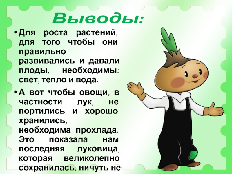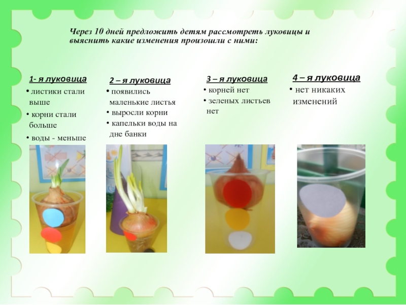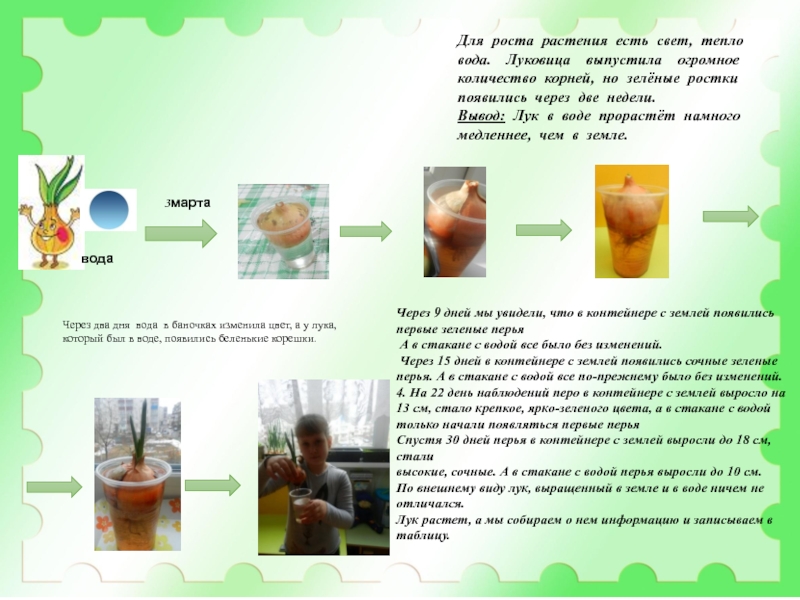 Вывод: Лук в воде прорастёт намного медленнее, чем в земле.