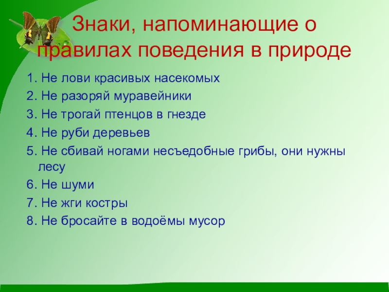 Знаки, напоминающие о правилах поведения в природе 1. Не лови красивых насекомых 2. Не разоряй муравейники 3.