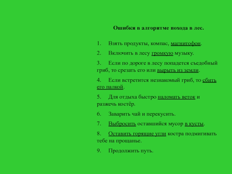 Ошибки в алгоритме похода в лес. 1.     Взять продукты, компас, магнитофон.2.     Включить в лесу громкую музыку.3.     Если по дороге в лесу попадется съедобный гриб, то срезать его или вырыть из земли.4.     Если встретится незнакомый гриб, то