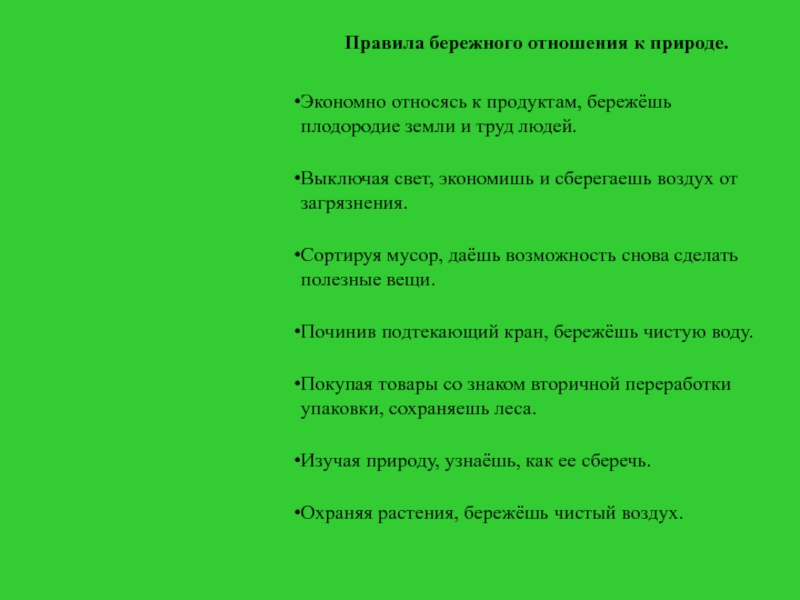 Правила бережного отношения к природе. Экономно относясь к продуктам, бережёшь плодородие земли и труд людей.  Выключая