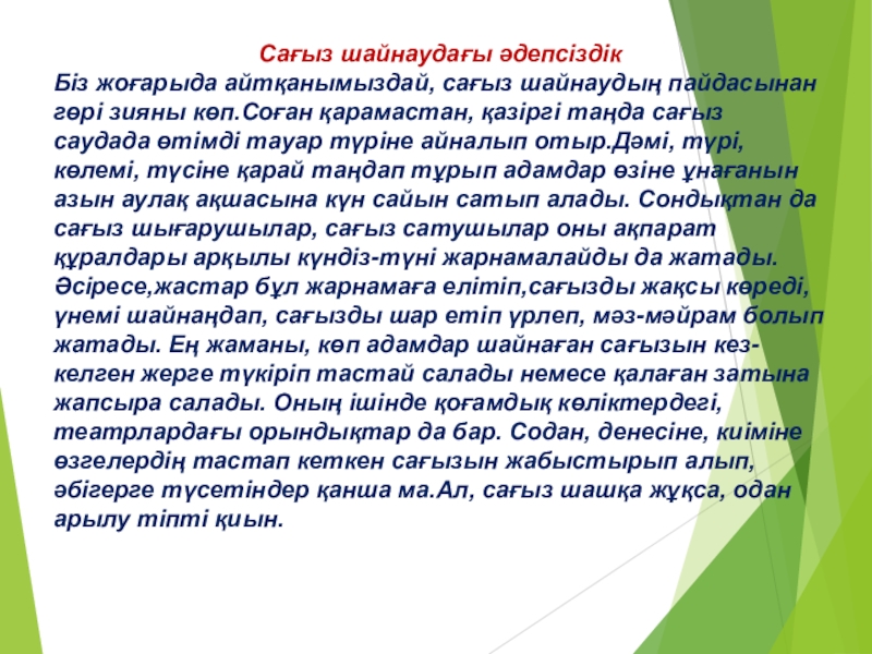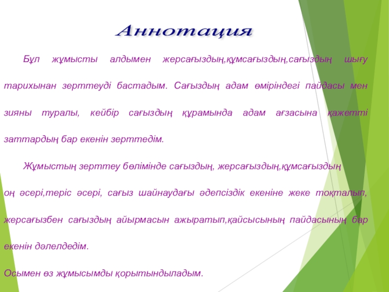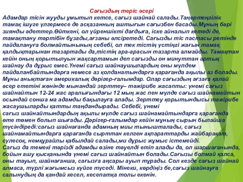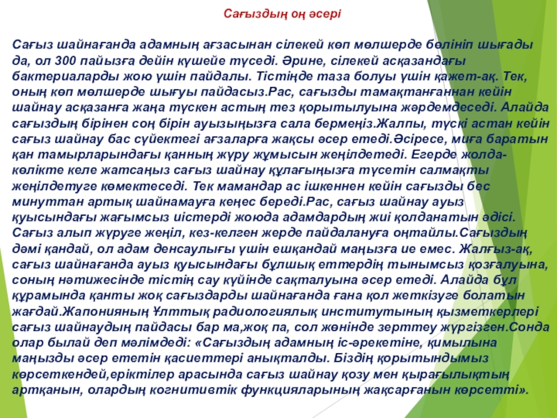 оң әсері,теріс әсері, сағыз шайнаудағы әдепсіздік екеніне жеке тоқталып,жерсағызбен сағыздың айырмасын ажыратып,қайсысының пайдасының бар екенін дәлелдедім.