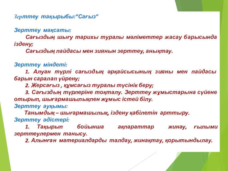 3. Сағыздың түрлеріне тоқталу. Зерттеу жұмыстарына сүйене отырып, шығармашылықпен жұмыс істей білу.