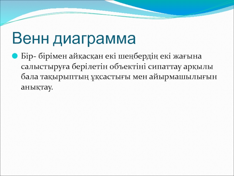Венн диаграммаБір- бірімен айқасқан екі шеңбердің екі жағына салыстыруға берілетін объектіні сипаттау арқылы бала тақырыптың ұқсастығы мен