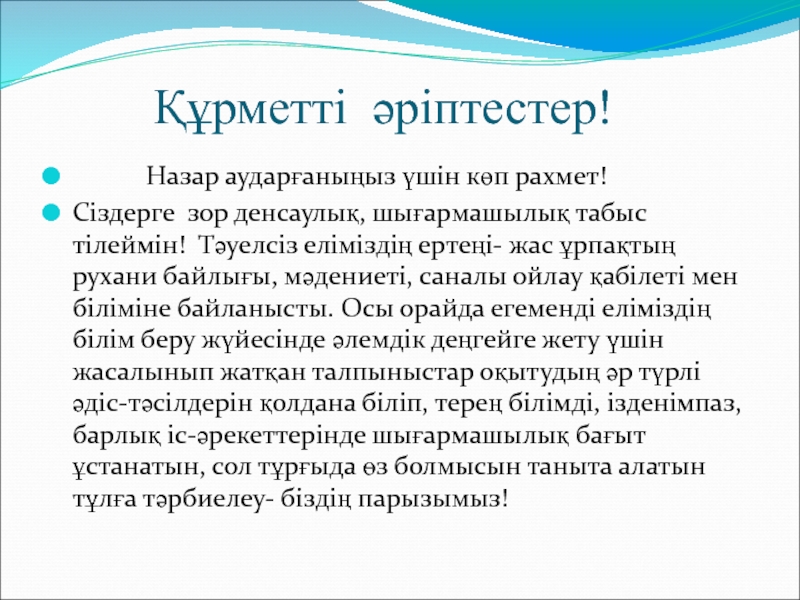 Сіздерге зор денсаулық, шығармашылық табыс тілеймін! Тәуелсіз еліміздің ертеңі- жас ұрпақтың рухани байлығы, мәдениеті, саналы ойлау қабілеті мен біліміне байланысты. Осы орайда егеменді еліміздің білім беру жүйесінде әлемдік деңгейге жету үшін жасалынып жатқан талпыныстар оқытудың әр түрлі әдіс-тәсілдерін қолдана біліп, терең білімді, ізденімпаз, барлық іс-әрекеттерінде шығармашылық бағыт ұстанатын, сол тұрғыда өз болмысын таныта алатын тұлға тәрбиелеу- біздің парызымыз!