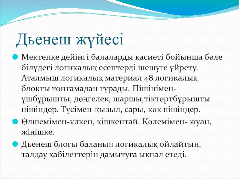 Дьенеш жүйесіМектепке дейінгі балаларды қасиеті бойынша бөле білүдегі логикалық есептерді шешуге үйрету.Аталмыш логикалық материал 48 логикалық