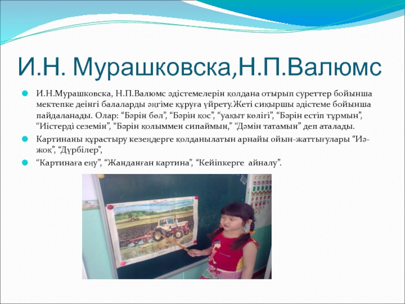 И.Н.Мурашковска, Н.П.Валюмс әдістемелерін қолдана отырып суреттер бойынша мектепке деінгі балаларды