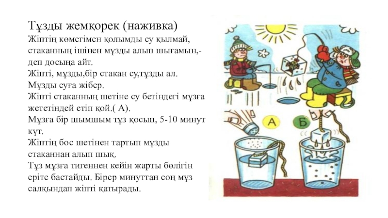 Слайд 4Тұзды жемқорек (наживка) Жіптің көмегімен қолымды су қылмай, стаканның ішінен мұзды алып