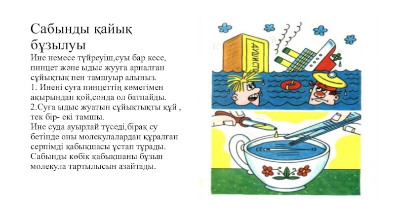 Сабынды қайық бұзылуы Ине немесе түйреуіш,суы бар кесе,пинцет және ыдыс жууға арналған сұйықтық пен тамшуыр алыныз. 1. Инені суға пинцеттің көмегімен ақырындап қой,сонда ол батпайды. 2.Суға ыдыс жуатын сұйықтықты құй ,тек бір- екі тамшы. Ине суда