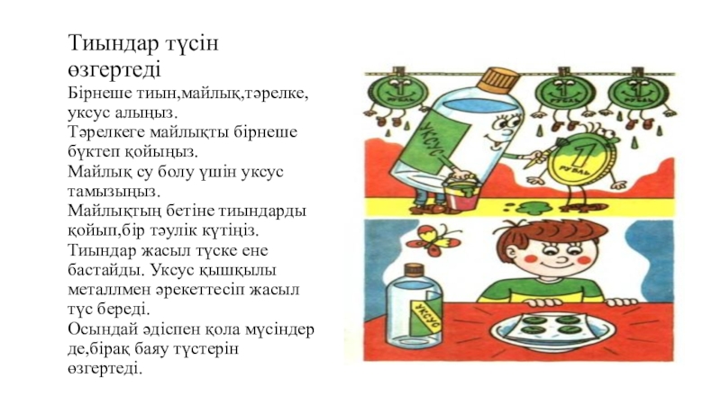 Слайд 5Тиындар түсін өзгертеді Бірнеше тиын,майлық,тәрелке,уксус алыңыз. Тәрелкеге майлықты бірнеше бүктеп қойыңыз. Майлық су болу