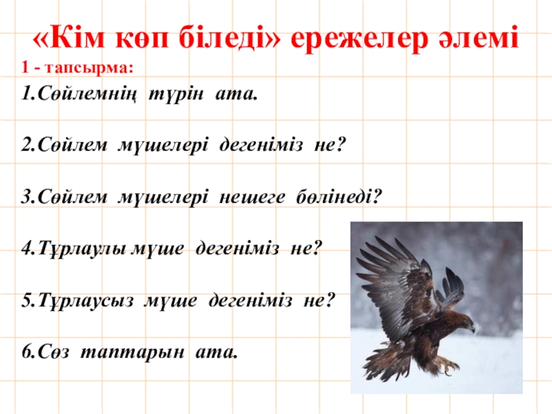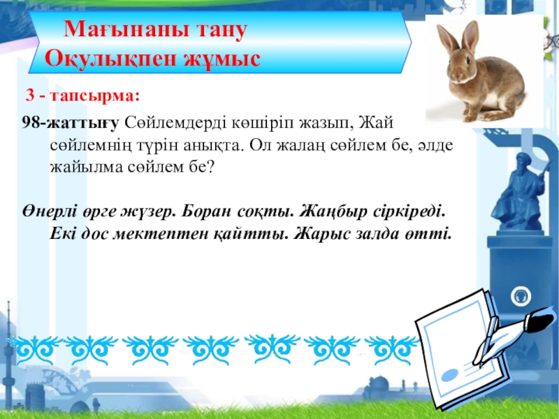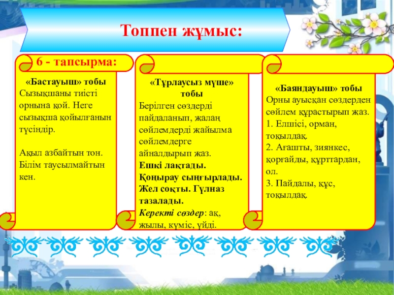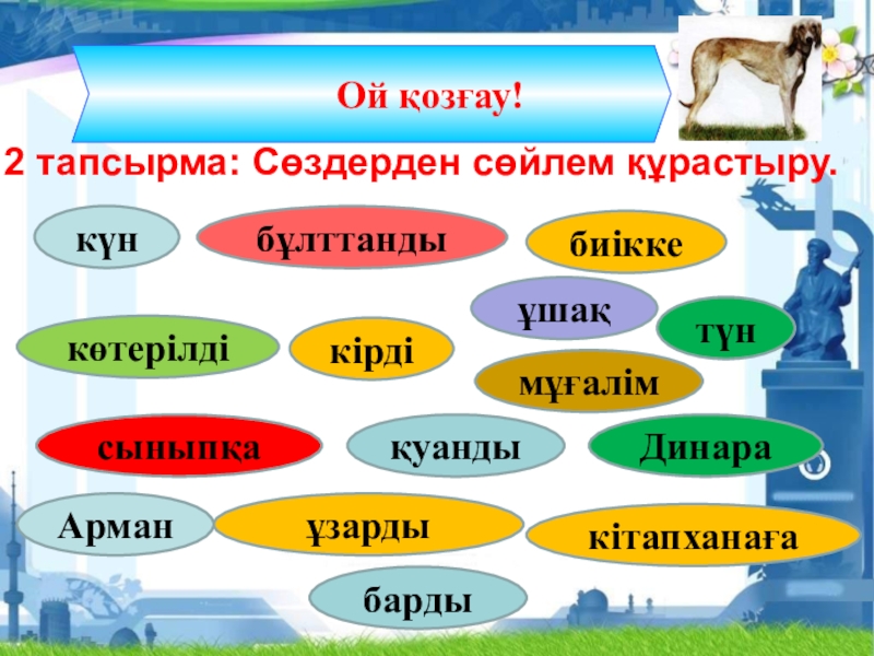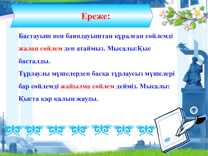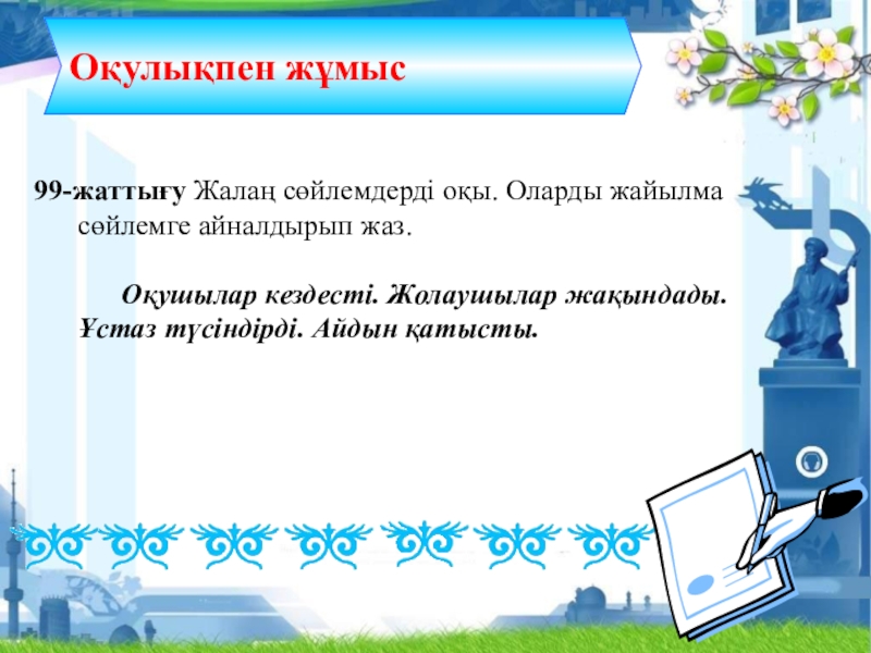 Берілген сөздерді пайдаланып, жалаң сөйлемдерді жайылма сөйлемдерге айналдырып жаз.
