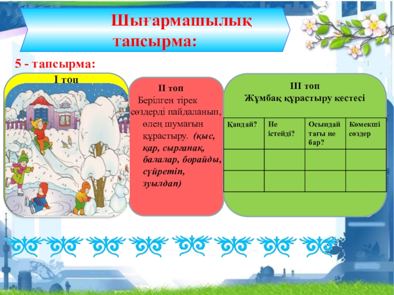 Керекті сөздер: ақ, жылы, күміс, үйді.