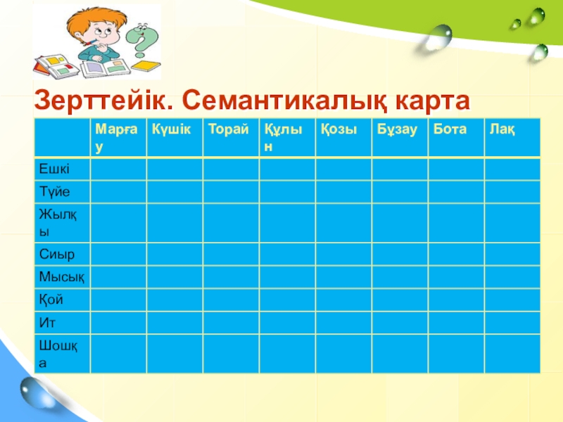 Кейбіреуі: Жануарлардың түрлерін, қоректерін біледі