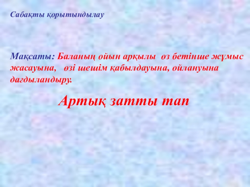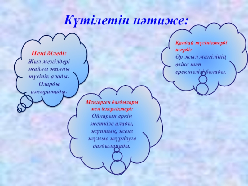 Ойларын еркін жеткізе алады, жұптық, жеке жұмыс жүргізуге дағдыланады.