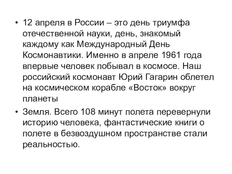 знакомый каждому как Международный День Космонавтики. Именно в апреле 1961 года впервые человек побывал в космосе. Наш российский космонавт Юрий Гагарин облетел на космическом корабле «Восток» вокруг планеты