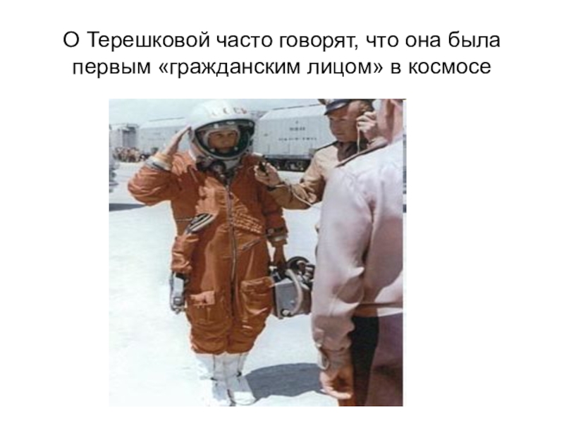 Слайд 5О Терешковой часто говорят, что она была первым «гражданским лицом» в