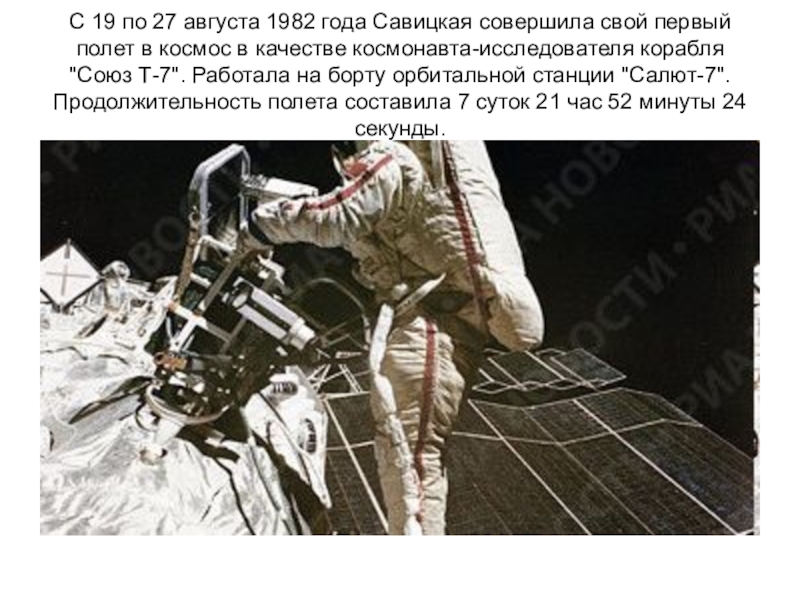 Слайд 9С 19 по 27 августа 1982 года Савицкая совершила свой первый