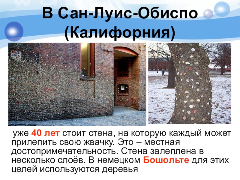 каждый может прилепить свою жвачку. Это – местная достопримечательность. Стена залеплена в несколько слоёв. В немецком Бошольте для этих целей используются деревья