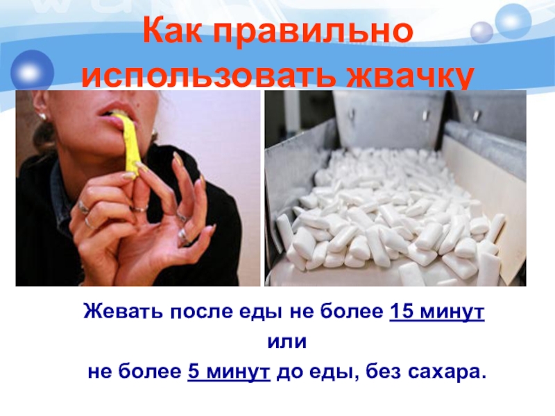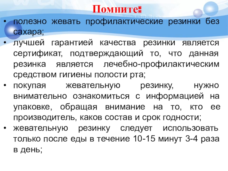 жевательную резинку следует использовать только после еды в течение 10-15 минут 3-4 раза в день;