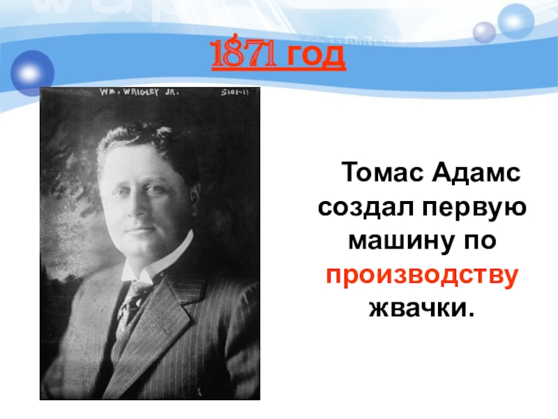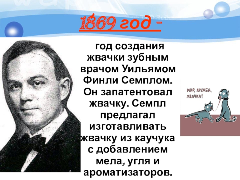 Уильямом Финли Семплом. Он запатентовал жвачку. Семпл предлагал изготавливать жвачку из каучука с добавлением мела, угля и ароматизаторов.