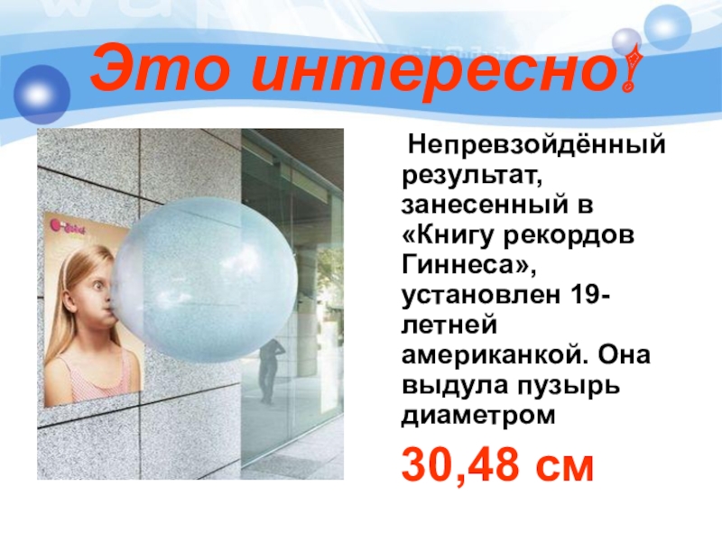 установлен 19-летней американкой. Она выдула пузырь диаметром