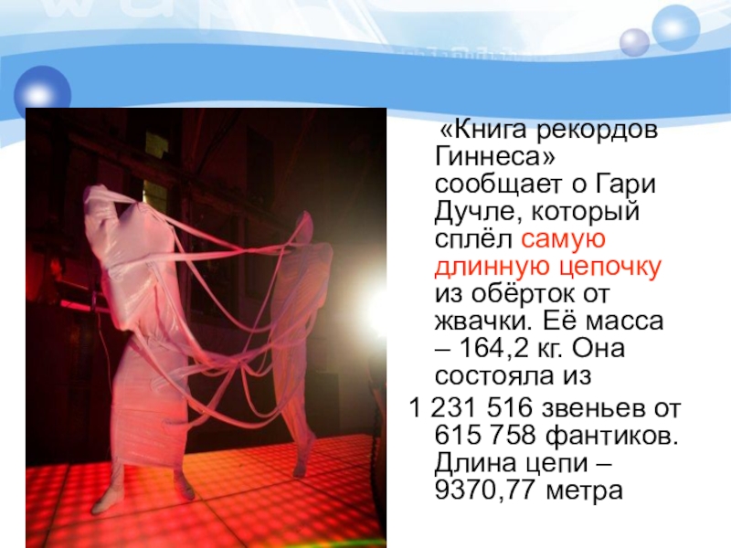 самую длинную цепочку из обёрток от жвачки. Её масса – 164,2 кг. Она состояла из