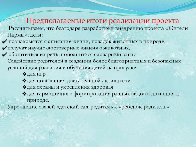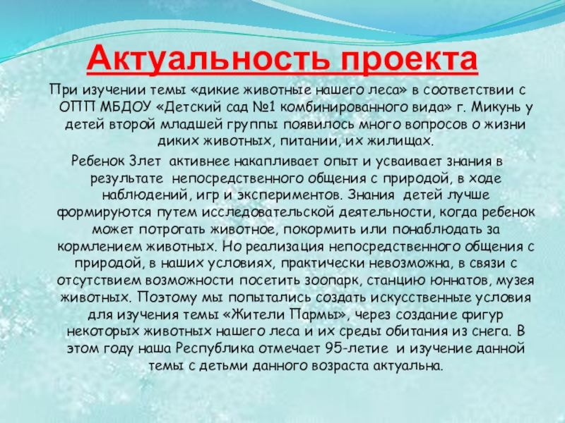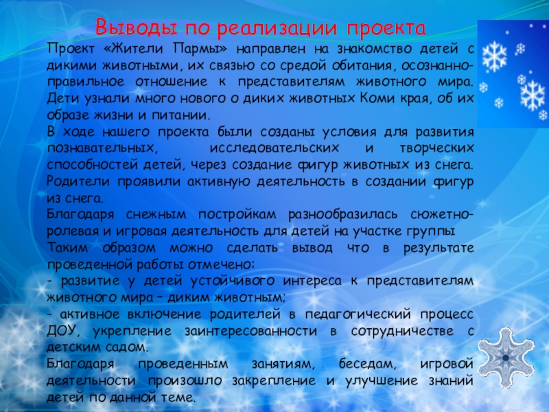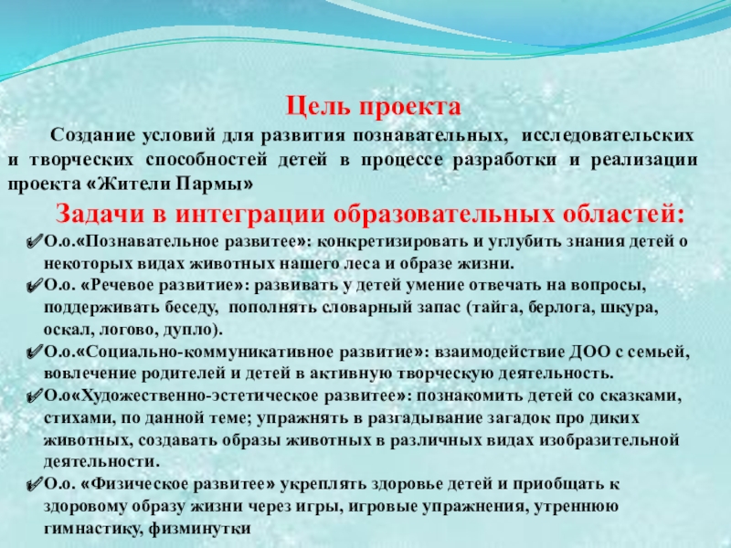 Создание условий для развития познавательных, исследовательских и творческих способностей детей в процессе разработки и реализации проекта «Жители Пармы»