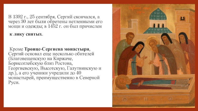 Слайд 39В 1392 г., 25 сентября, Сергий скончался, а через 30 лет