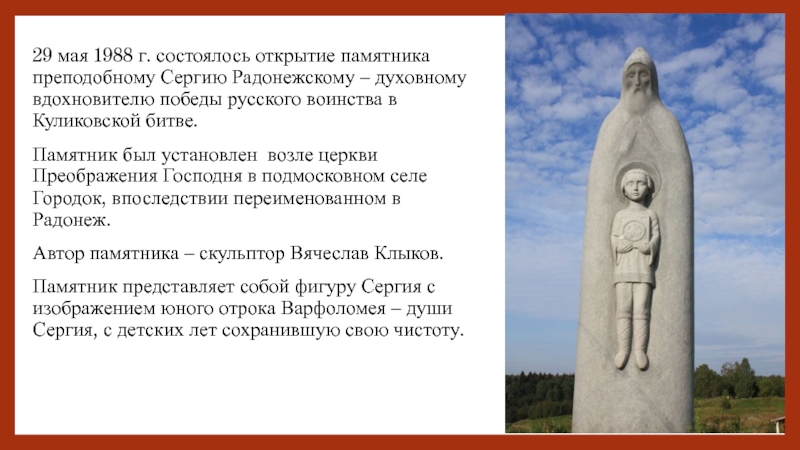Слайд 4229 мая 1988 г. состоялось открытие памятника преподобному Сергию Радонежскому –