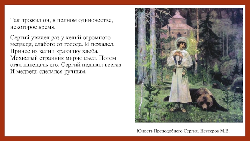 келий огромного медведя, слабого от голода. И пожалел. Принес из келии краюшку хлеба. Мохнатый странник мирно съел. Потом стал навещать его. Сергий подавал всегда. И медведь сделался ручным.