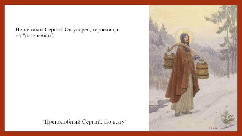 Слайд 13Но не таков Сергий. Он упорен, терпелив, и он “боголюбив”.