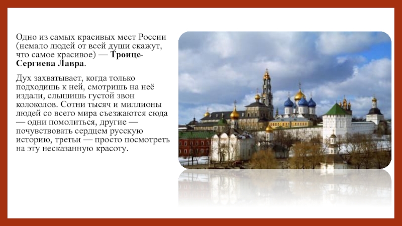 Дух захватывает, когда только подходишь к ней, смотришь на неё издали, слышишь густой звон колоколов. Сотни тысяч и миллионы людей со всего мира съезжаются сюда — одни помолиться, другие — почувствовать сердцем русскую историю, третьи — просто посмотреть на эту несказанную красоту.