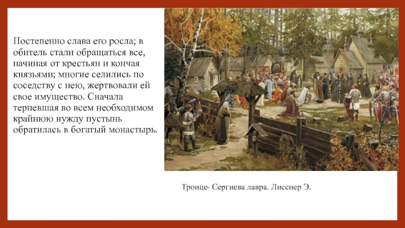 Слайд 23Постепенно слава его росла; в обитель стали обращаться все, начиная от