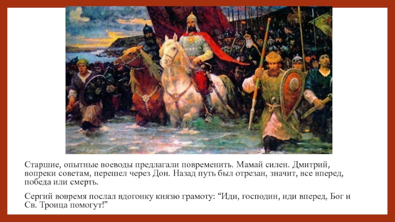 Слайд 31Старшие, опытные воеводы предлагали повременить. Мамай силен. Дмитрий, вопреки советам, перешел