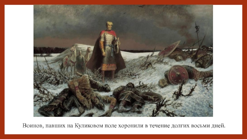 Слайд 36Воинов, павших на Куликовом поле хоронили в течение долгих восьми дней.