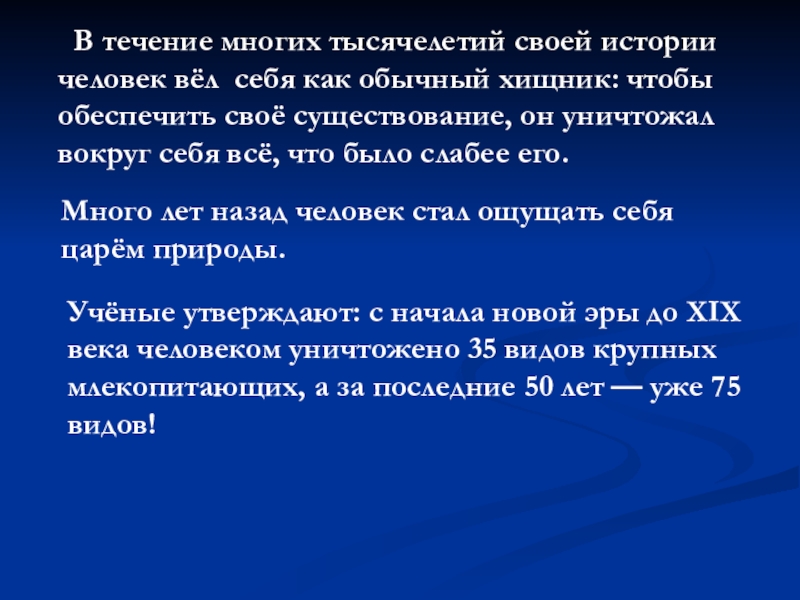 Учёные утверждают: с начала новой эры до XIX века человеком уничтожено 35 видов крупных млекопитающих, а за последние 50 лет — уже 75 видов!