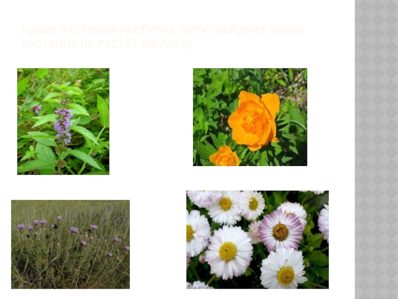Слайд 3Какие растения растутна лугу? Найдите какое растение не растёт на лугу)