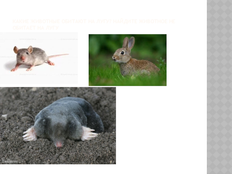 Слайд 4Какие животные обитают на лугу? Найдите животное не обитает на лугу