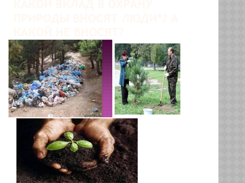 Слайд 17Какой вклад в охрану природы вносят люди*? А какой не вносят?