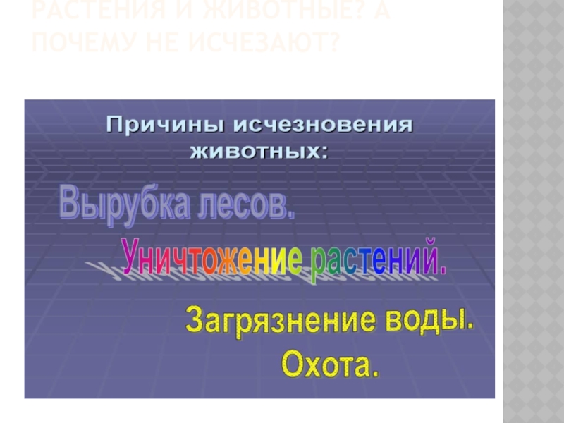 Слайд 16Почему в природе исчезают растения и животные? А почему не исчезают?
