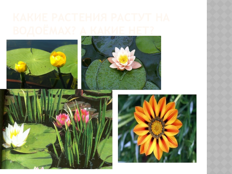 Слайд 13Какие растения растут на водоёмах? А какие нет?