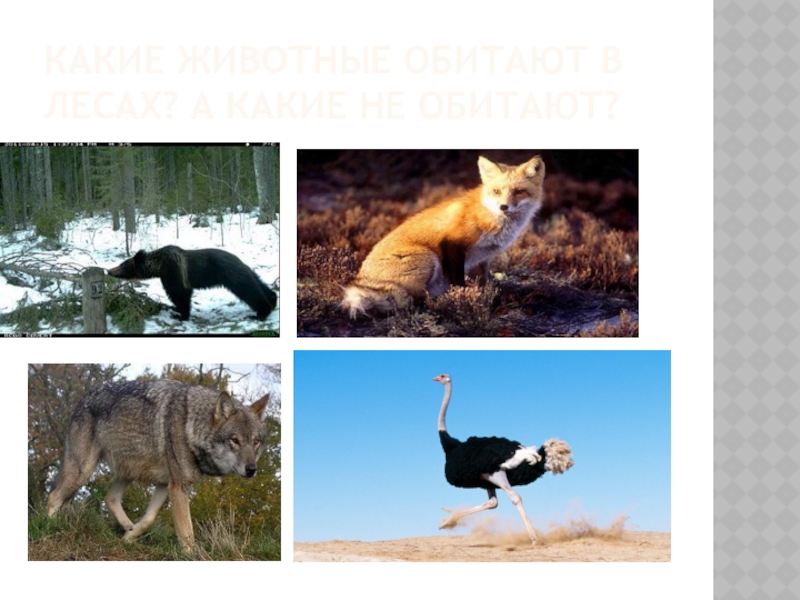 Слайд 10Какие животные обитают в лесах? А какие не обитают?