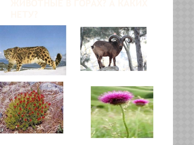 Слайд 12Какие есть растения и животные в горах? А каких нету?