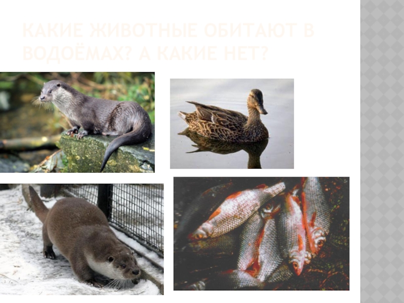 Слайд 14Какие животные обитают в водоёмах? А какие нет?