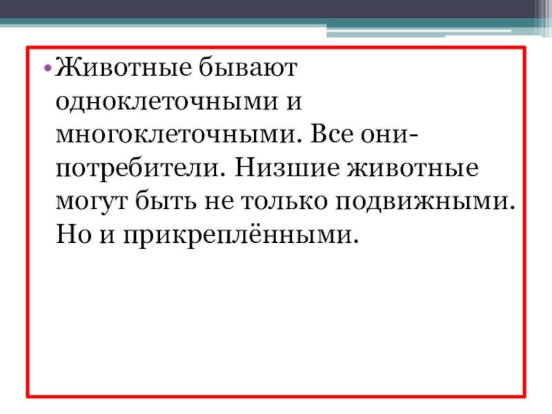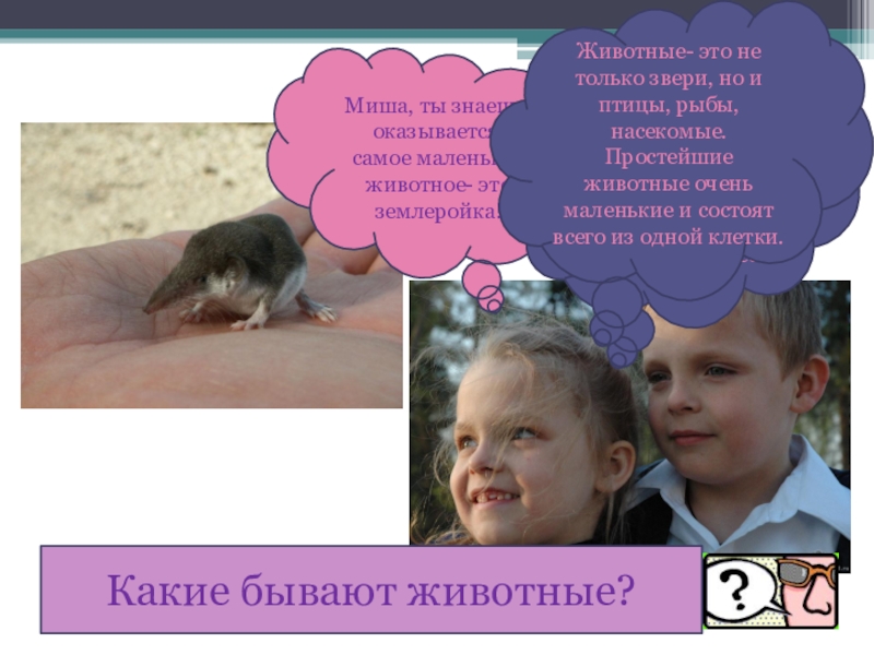 Животные- это не только звери, но и птицы, рыбы, насекомые. Простейшие животные очень маленькие и состоят всего из одной клетки.