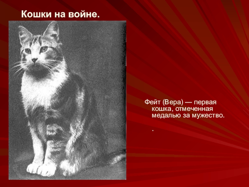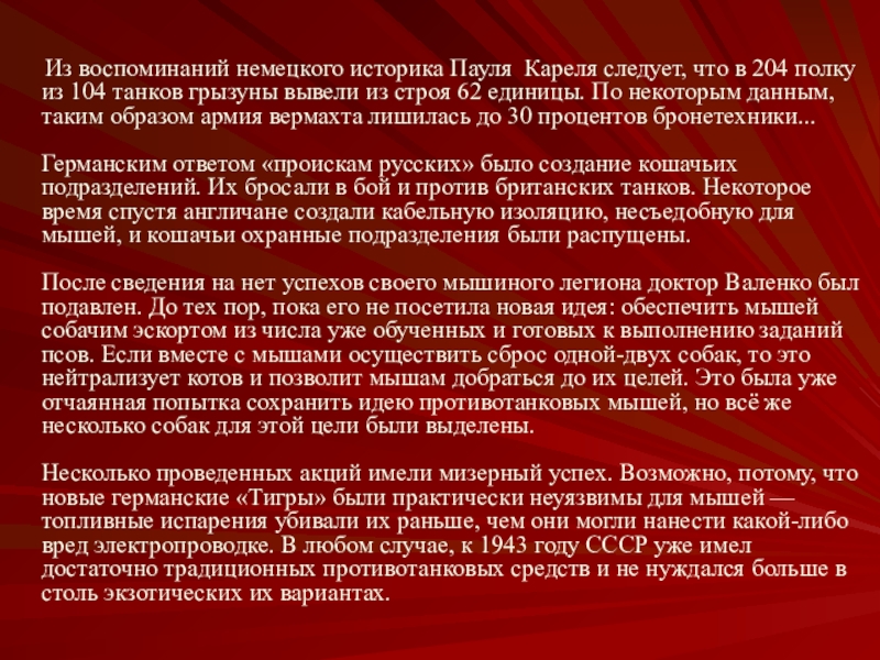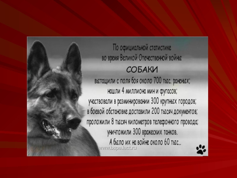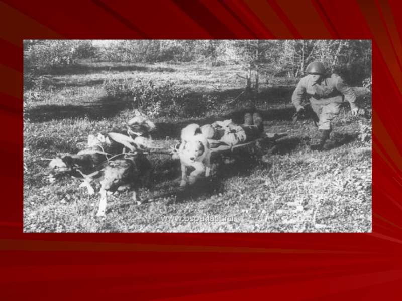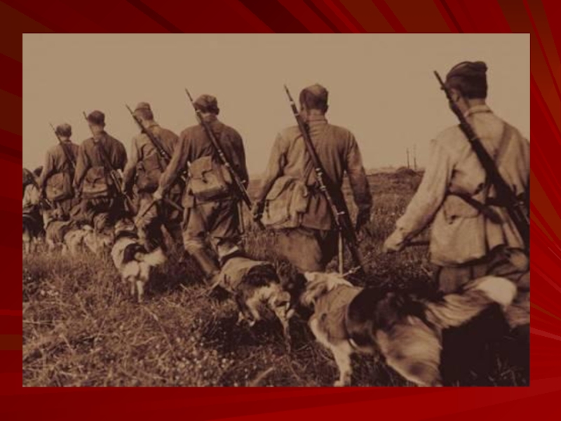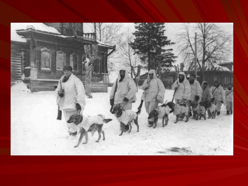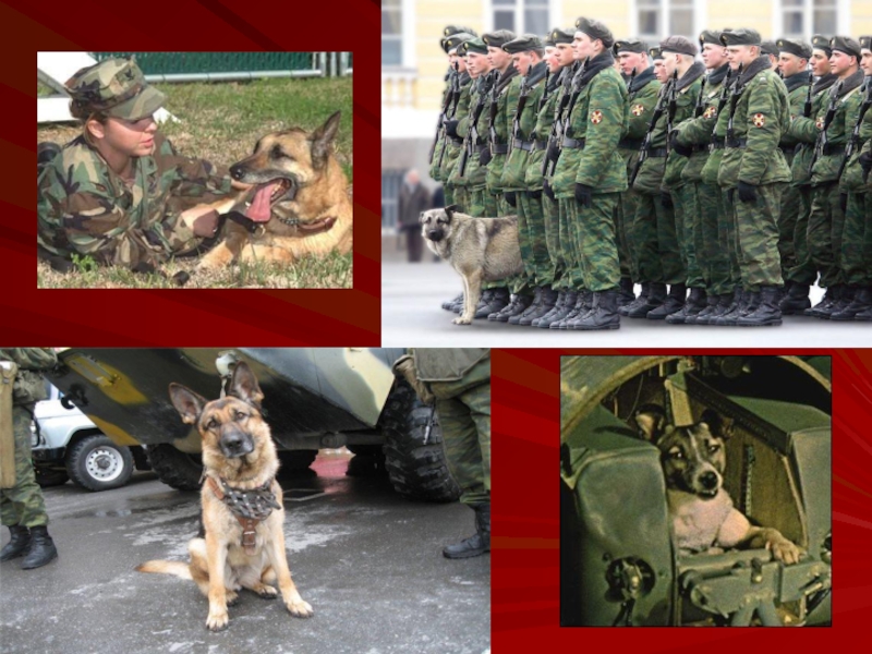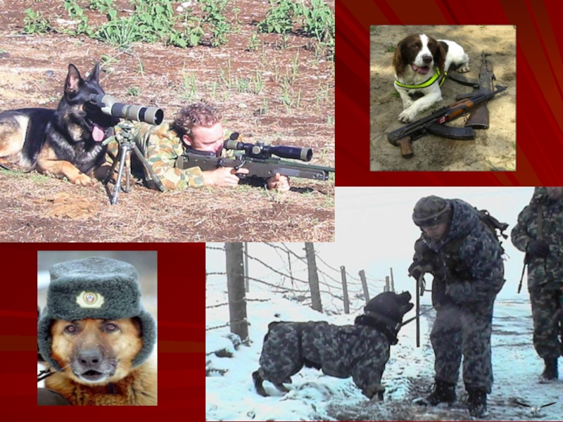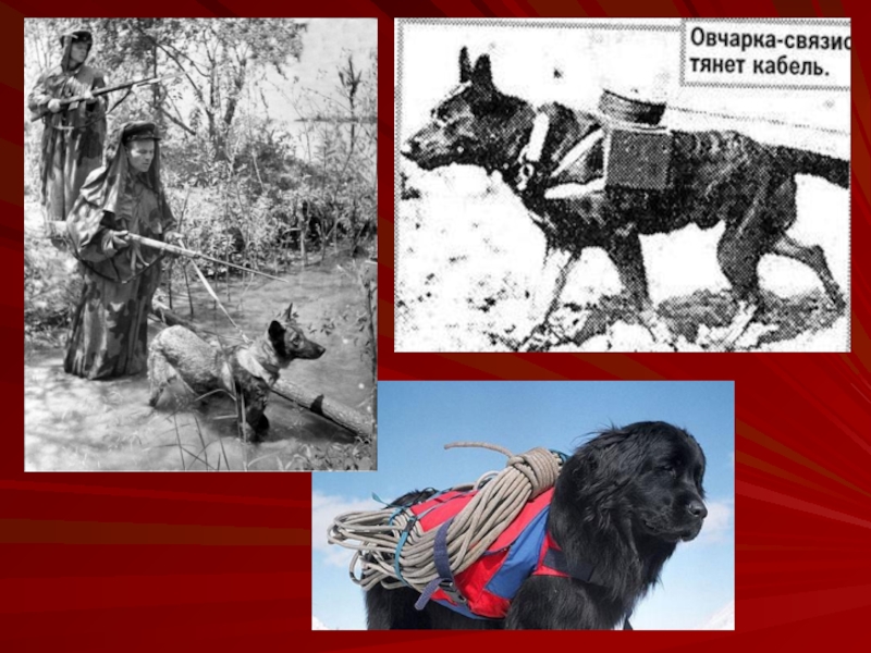 доставку боеприпасов и питания, вывоз раненых с поля боя, обнаружение снайперов, собаки-связисты, минно-розыскные собаки, сторожевые собаки, собаки разведывательной службы, диверсионные собаки — собаки-истребители танков и железнодорожных составов.