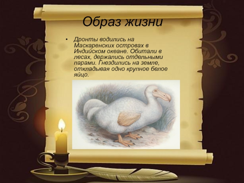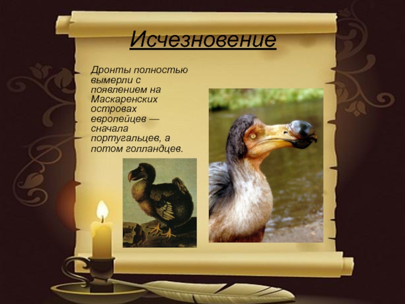 Исчезновение   Дронты полностью вымерли с появлением на Маскаренских островах европейцев — сначала португальцев, а потом голландцев.