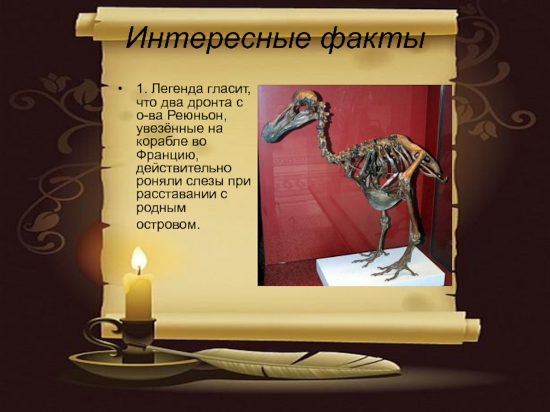 Интересные факты1. Легенда гласит, что два дронта с о-ва Реюньон, увезённые на корабле во Францию, действительно роняли