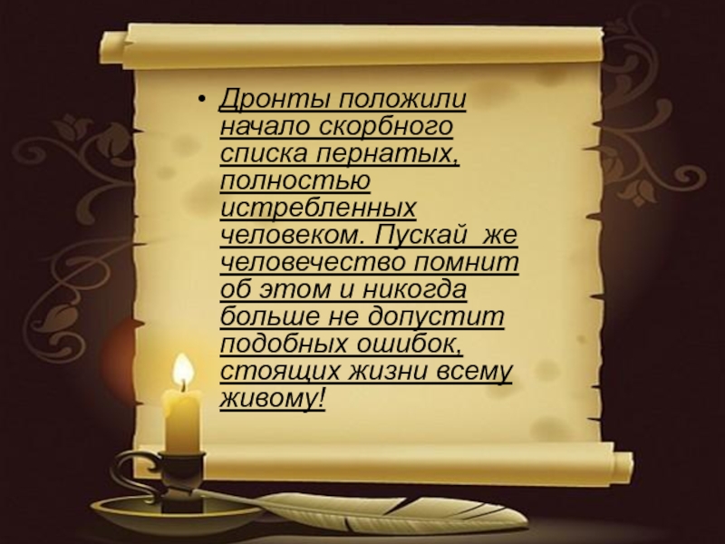 Слайд 6Дронты положили начало скорбного списка пернатых, полностью истребленных человеком. Пускай же