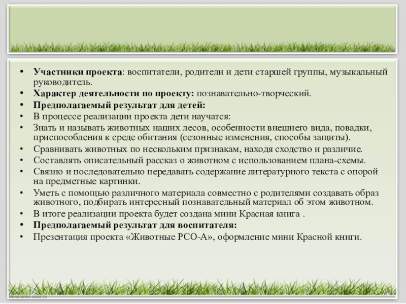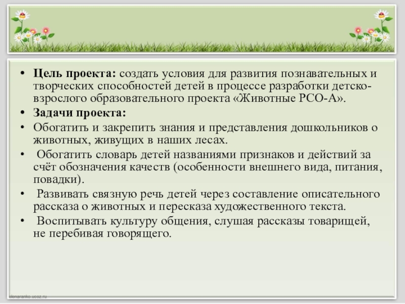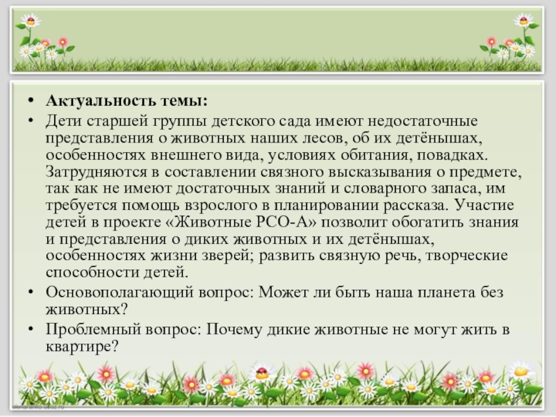 наших лесов, об их детёнышах, особенностях внешнего вида, условиях обитания, повадках. Затрудняются в составлении связного высказывания о предмете, так как не имеют достаточных знаний и словарного запаса, им требуется помощь взрослого в планировании рассказа. Участие детей в проекте «Животные РСО-А» позволит обогатить знания и представления о диких животных и их детёнышах, особенностях жизни зверей; развить связную речь, творческие способности детей.